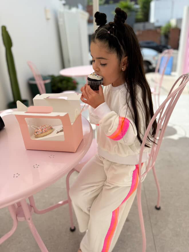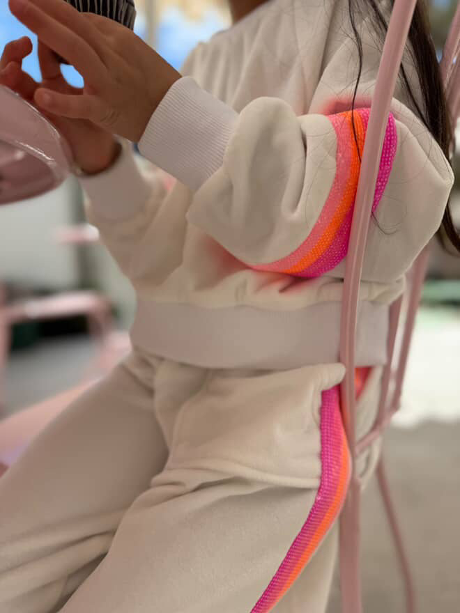 β’ Custom Embroidery: Unique neon rainbow sequin stripe design made exclusively for Dollfaced Kids.