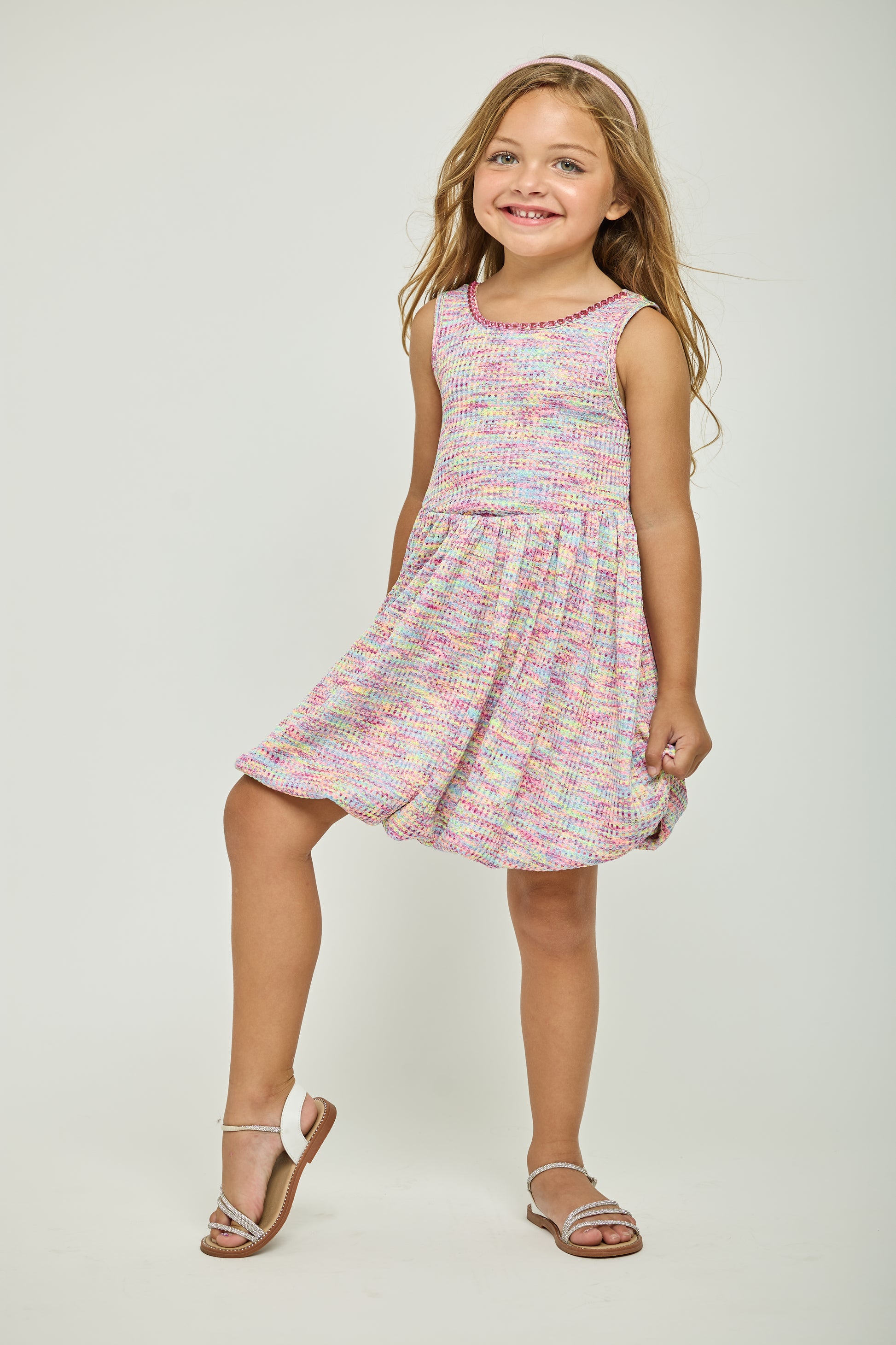 Soft, stretchy, and lightweight, this dress is ideal for spring celebrations, summer birthdays, vacations, and special moments where a little extra shine is required. The bubble hem creates a fun, fashion-forward shape that girls love—easy to wear, easy to move, and effortlessly chic.
