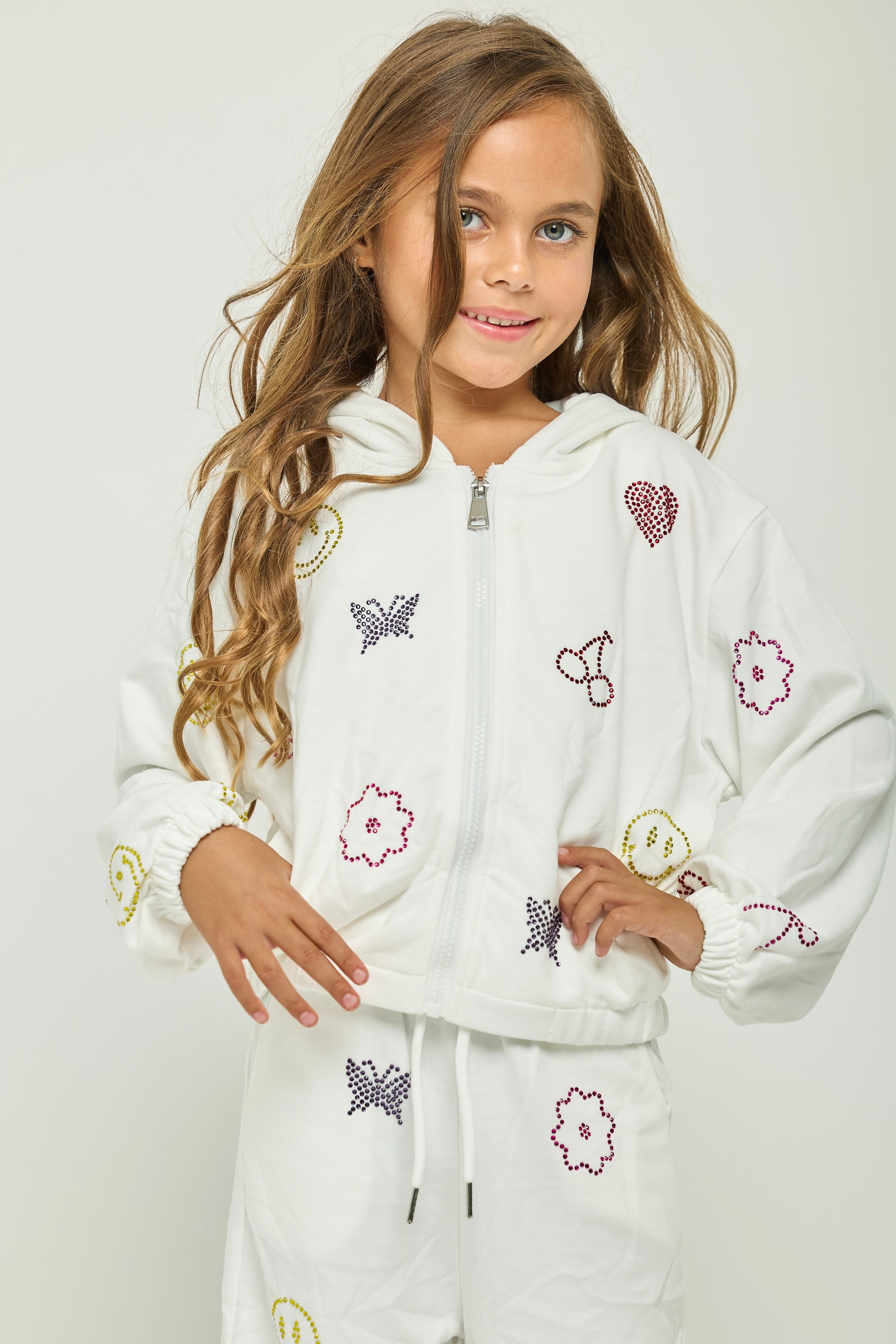 Step into effortless glamour with our White Crystal Charm Jacket & Pant Set, designed to sparkle in both kids and mommy & me sizes. Made from a luxurious white cotton blend, this set feels as incredible as it looks. The custom rhinestone charm design adds a signature Dollfaced touch, catching the light like jewelry with every move.