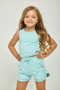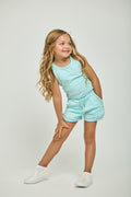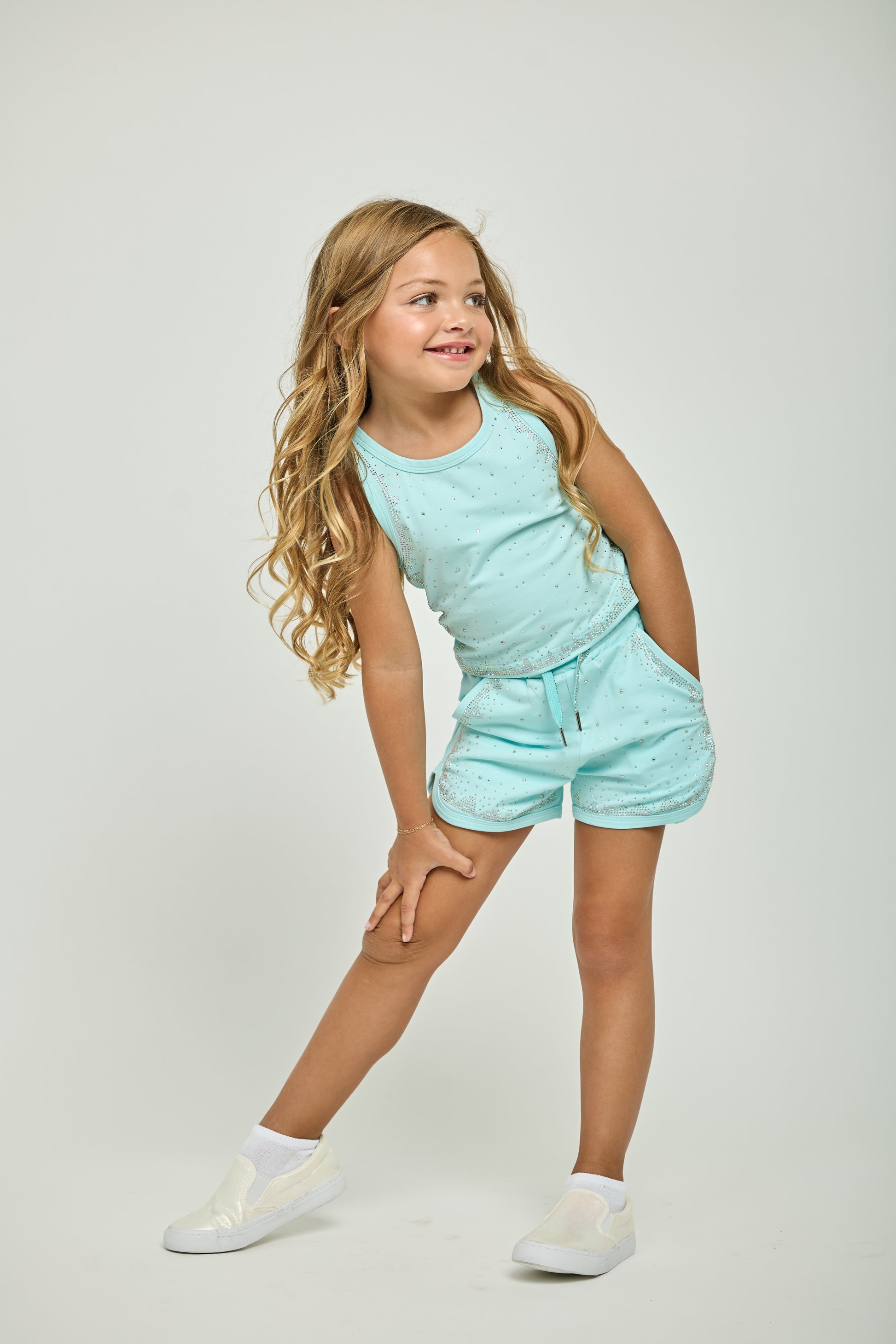 β¨Shine bright like a diamond in the Teal Diamond Sparkle Short Set β a one-of-a-kind glam piece made for little stars who were born to sparkle! π«π This dreamy teal-aqua set is crafted from super premium stretch cotton and covered in iridescent rhinestones pressed into a dazzling diamond starburst pattern that catches the light from every angle. β¨π